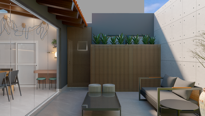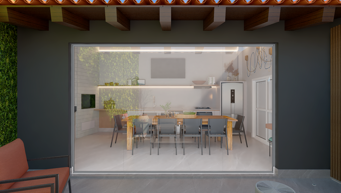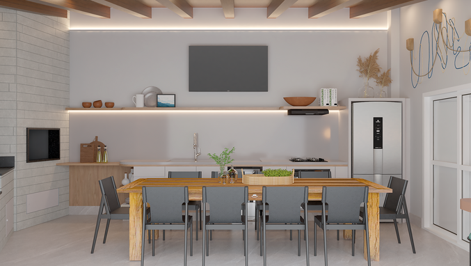 Utilizamos a estrutura existente da área de churrasqueira dos clientes para transformá-la em um espaço moderno, utilizando tons neutros de cinza, madeira e concreto. A iluminação foi projetada pontualmente para destacar linhas e materiais, criando diversas possibilidades de cenários de uso.